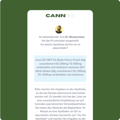 Bei CannGo zahlen Sie nicht pro Erstrezept oder Folgerezept, sondern pro Behandlungsanfrage. Eine Behandlungsanfrage mit darauffolgender Ausstellung einer Privatverordnung – falls medizinisch indiziert – kostet pro Anfrage 14,99 €. Dabei ist wichtig zu beachten, dass es sich bei der zu leistenden Zahlung um eine Kaution handelt, die mit der gleichpreisigen Behandlungsgebühr durch den behandelnden Arzt verrechnet wird.