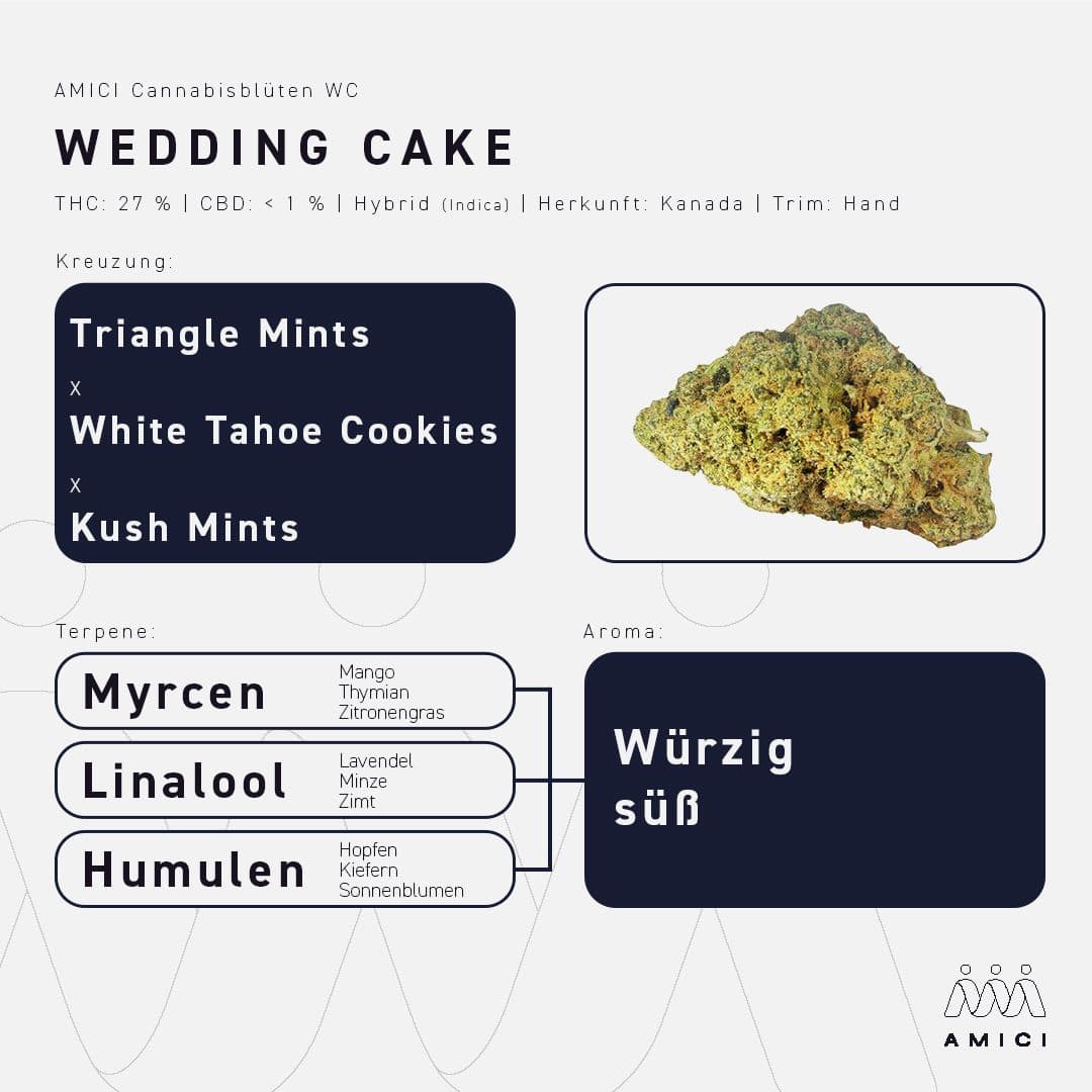 27/1 Amici WC mit dem Strain Wedding Cake hat eine Hybrid-Genetik. Der Wirkstoffgehalt liegt bei ungefähr 27,0% THC und < 1,0% CBD. Die Blütensorte ist unbestrahlt und wird in Kanada produziert.
