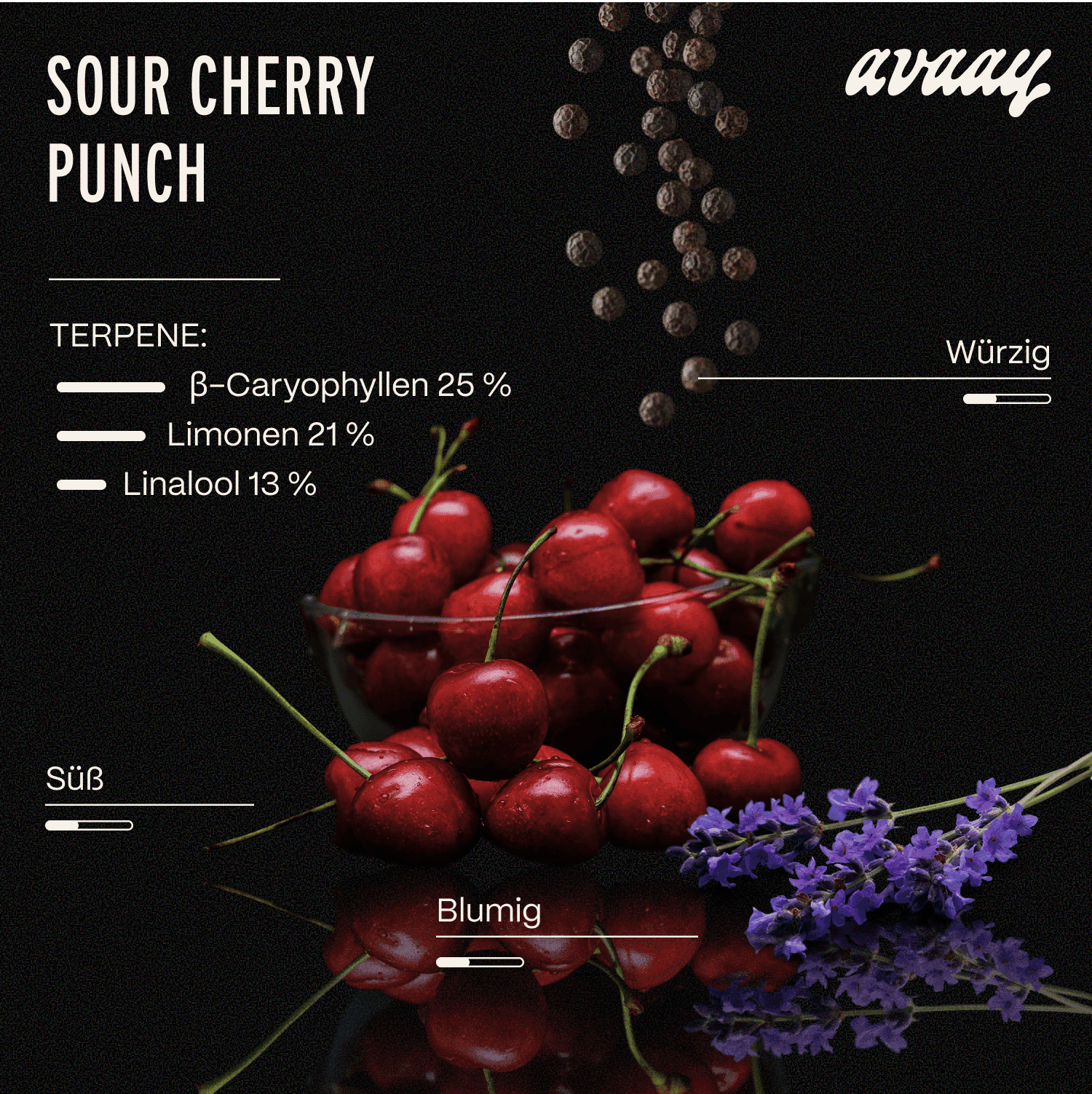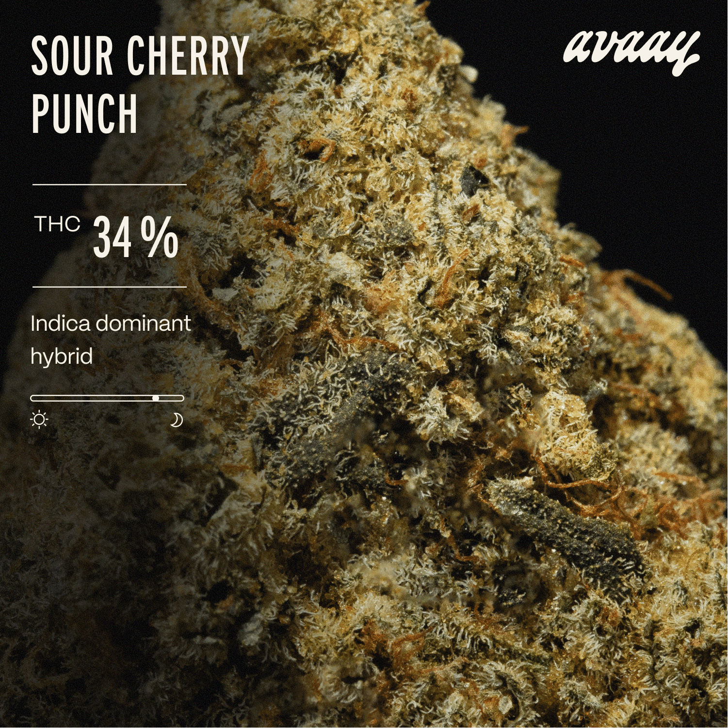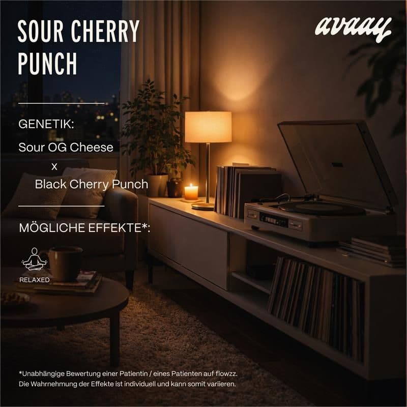 avaay 34/1 SCP mit dem Strain Sour Cherry Punch hat eine Hybrid-Genetik. Der Wirkstoffgehalt liegt bei ungefähr 34,0% THC und < 1,0% CBD. Die Blütensorte ist unbestrahlt und wird in Kanada produziert.