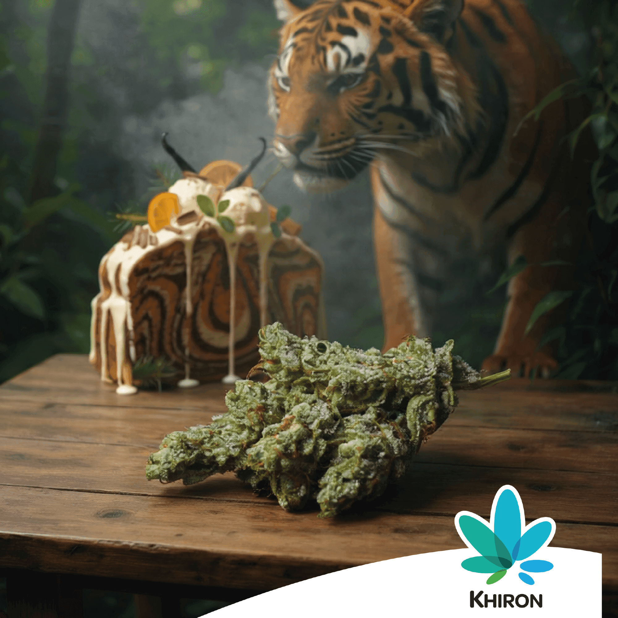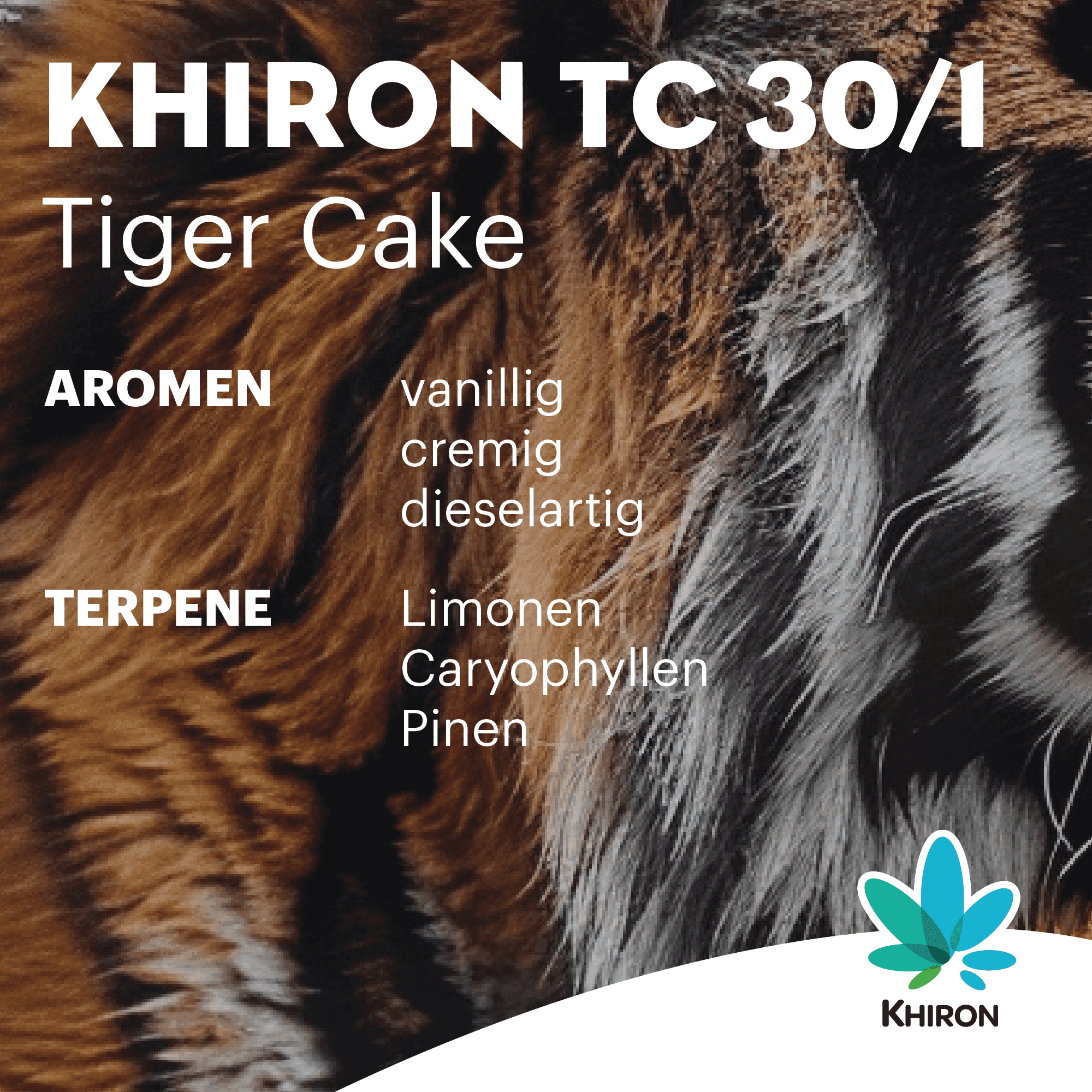 Der Gesamtterpengehalt von KHIRON TC 30/1 Tiger Cake liegt bei rund 3,6 Prozent w/w. Dominant sind Limonen, Caryophyllen, Pinen, Linalool und Humulen. Diese Kombination prägt das vielschichtige Aromaprofil. Viele Anwender beschreiben Tiger Cake als stimmungsaufhellend, Euphorie auslösend und zugleich körperlich entspannend. Zusammen mit der appetitanregenden Wirkung entsteht ein rundes, wohltuendes Profil – das an die Frage erinnert, ob nach dem Dessert vielleicht noch ein Dessert folgt?
