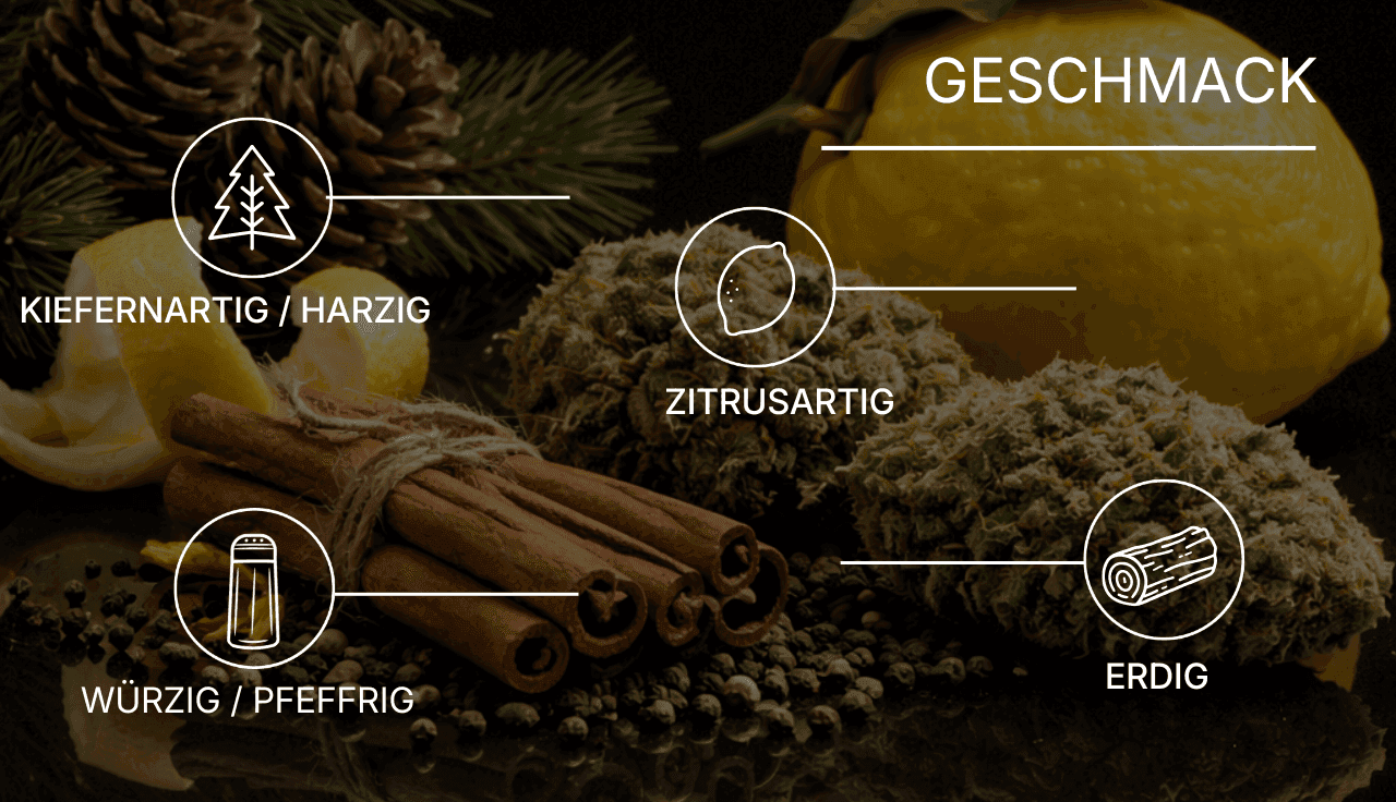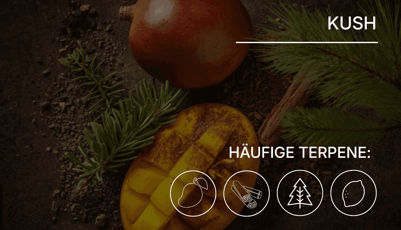 Kush-Sorten haben ihr typisches Aroma durch eine Kombination verschiedener Terpene – das sind natürliche Duft- und Geschmacksstoffe in der Pflanze. Zusammen erzeugen sie den charakteristischen „schweren, erdigen Kush-Style“.