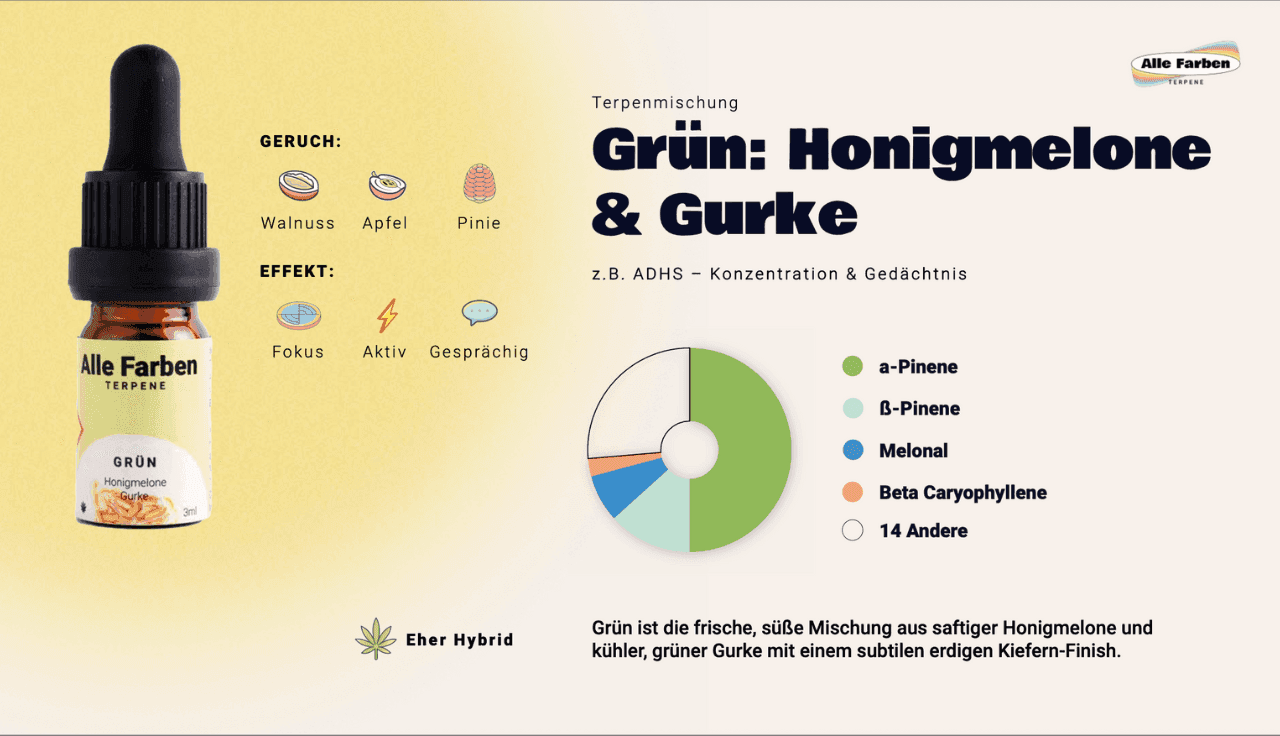 Typischerweise sorgt Pinene für ein leichtes, sauberes Geschmacksprofil, das viele Nutzer als erfrischend und nicht beschwerend empfinden. Besonders in sativa-lastigen Sorten unterstützt es ein aktives, fokussiertes Erlebnis und verleiht dem Geschmack eine grüne, lebendige Note.
