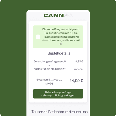 Bei CannGo zahlen Sie nicht pro Erstrezept oder Folgerezept, sondern pro Behandlungsanfrage. Eine Behandlungsanfrage mit darauffolgender Ausstellung einer Privatverordnung – falls medizinisch indiziert – kostet pro Anfrage 14,99 €. Dabei ist wichtig zu beachten, dass es sich bei der zu leistenden Zahlung um eine Kaution handelt, die mit der gleichpreisigen Behandlungsgebühr durch den behandelnden Arzt verrechnet wird.